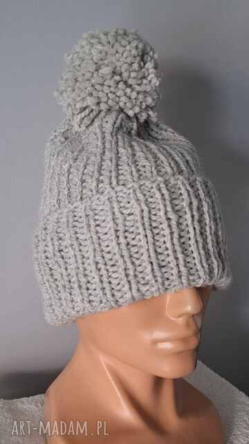 czapka beanie handmade z pomponem jasnoszara, wykonana na drutach