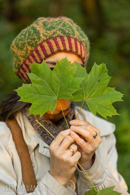 Ma kształt fantazyjnego beretu. Powstała z włóczki o szlachetnym składzie (wełna owcza, wełna alpaki, wiskoza), częściowo filcowanej, która pozwala uzyskać dzianiny ciepłe i miękkie o nieco rustykalnym charakterze. Brzeg beretu wykonany został z podwójnej dzianiny, co daje dodatkową izolację termiczną. Unikatowy żakardowy wzór nawiązuje do pięknej rośliny runa leśnego - kopytnika pospolitego. Motyw jego zimozielonych liści zdobi główną część czapki, zaś na jej zwieńczeniu znajdziesz wspomnienie o tajemniczych trójpłatkowych kwiatach kopytnika.