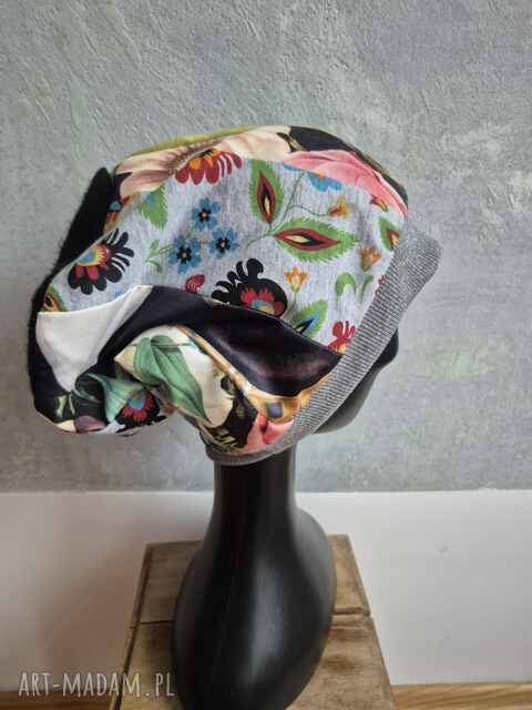 handmade czapka damska smerfetka patchworkowa, na podszewce dobra na codzienne noszenie