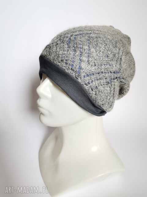 handmade czapka damska szara z niebieskim azuriwa etno boho folk na podszewce, rozmiar