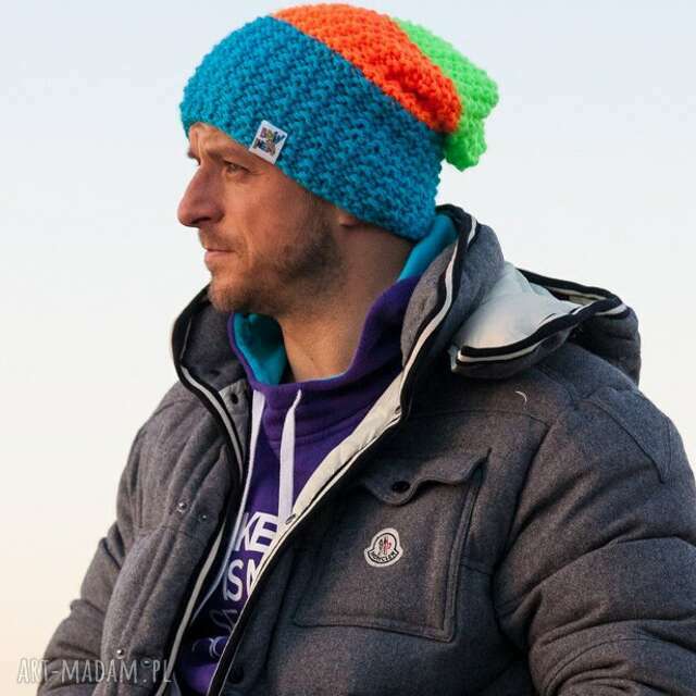Gruba i ciepła czapka z miękkiej i przyjemnej w dotyku włóczki akrylowej, wykonana ręcznie na drutach.