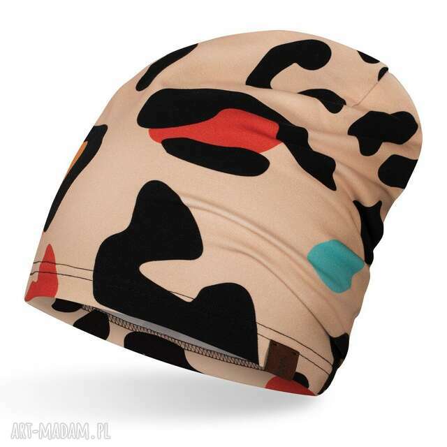 handmade czapka dresowa smerfetka, krasnal czpak w gepardy, kolorowa czapka wiosenna