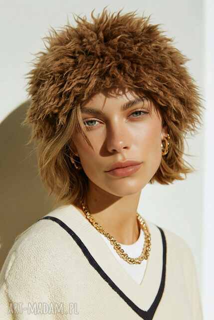 Czapka sztuczne futro kolor jasny brąz rękodzieło na podszewce pojedynczy egzemplarz miękka miła nie