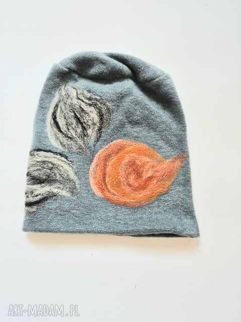 czapka wełniana filcowana zimowa handmade w kwiaty na podszewce - rozmiar uniwersalny, wełniana, fil