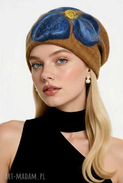 czapka wełniana filcowana zimowa miodowa handmade w kwiaty na podszewce-- rozmiar uniwersalny, wełniana, filcowana wełną merynosów, bardzo ciepła, fantastyczna, miła, miękko układa się na głowie, niesamowicie zwraca uwagę, doskonałą na codzienne noszenie jak i na prezent, zawsze możesz ją założyć po basenie i przeżyjesz, box 44