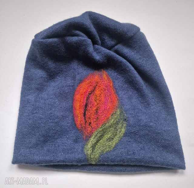 ręcznie robione czapka wełniana filcowana zimowa niebieska handmade w kwiaty