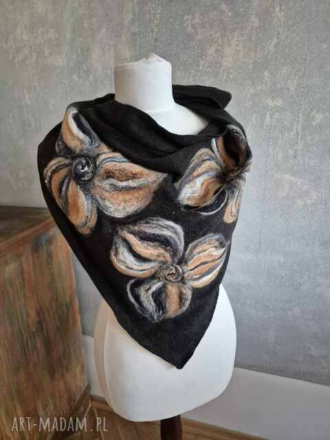 czarna chusta handmade wełniana, elementy filcowane to wełna merynosów, produkt wysokiej