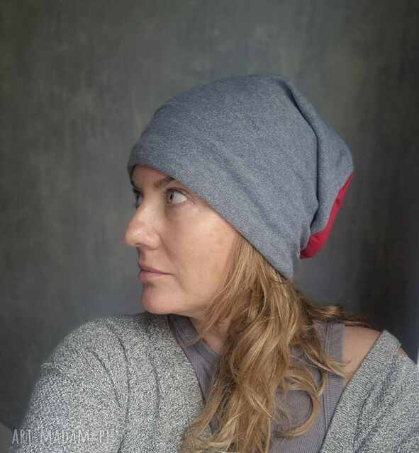 handmade czapka szaro - czerwona smerfetka podszewce rozmiar uniwersalny rozciągliwa