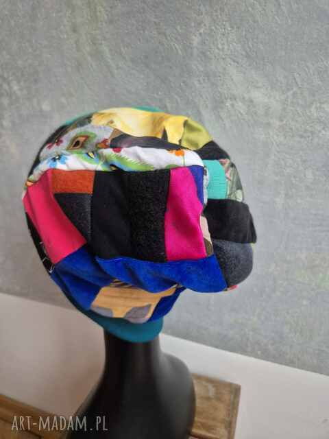 Czapka damska Smerfetka patchworkowa, na podszewce dobra na codzienne noszenie, wykonana w pojedynczym egzemplarzu rękodzieło polecam boks d1