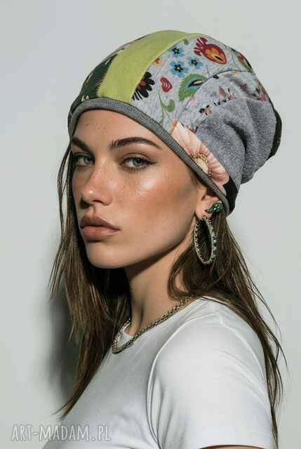 Czapka damska Smerfetka patchworkowa, na podszewce dobra na codzienne noszenie, wykonana w pojedyncz