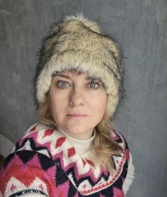 ręcznie wykonane futrzana czapka długo włos szara ecru zwariowana duża, trzeba lubić
