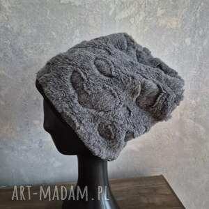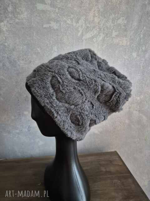 handmade futrzana czapka szara smerfetka na podszewce bardzo ciepła duża wykończona