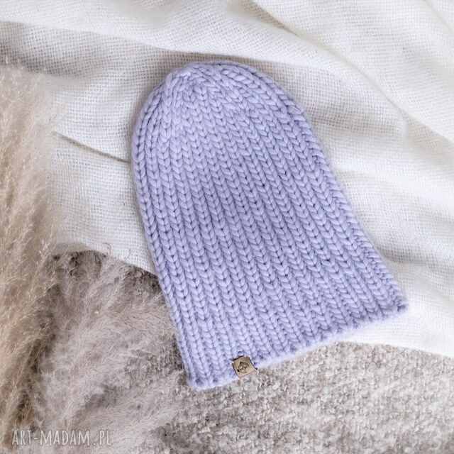 Ręcznie robiona czapka w pięknym kolorze jasnego fioletu, wykonana z