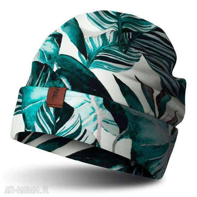 Czapka beanie jesienno-zimowa biała w turkusowe liście