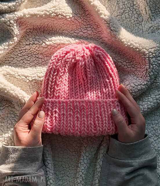 krótka czapka beanie handmade z pomponem jasnoróżowa, wykonana na drutach