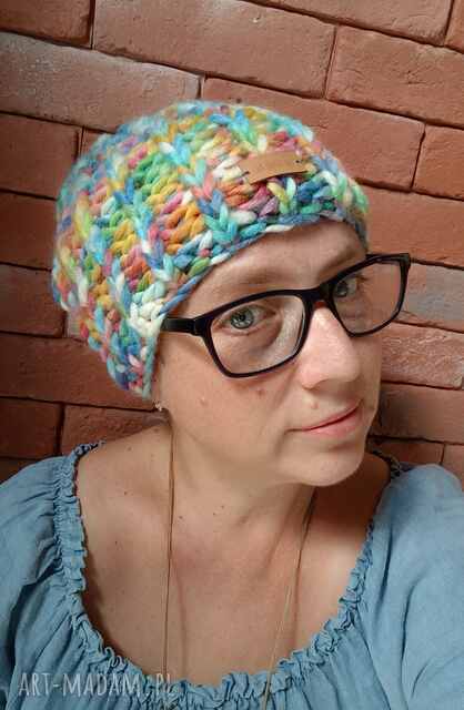 Lekka, bezszwowa czapka wykonana z barwnej wełnianej włóczki. Kolorowa, wesoła, lekka i wygodna luźna i swobodna. Na głowę o obwodzie 54-60 cm, wysokość 23 cm. Skład 80 % virgin Wool 20 % polyacryl. Pranie ręczne.
