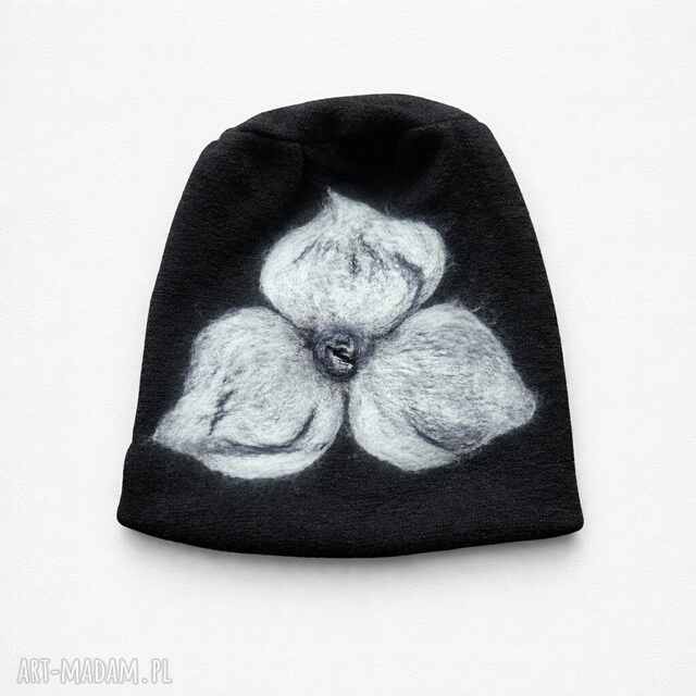 czapka wełniana filcowana zimowa czarna handmade w kwiaty na podszewce - rozmiar uniwersalny, weł