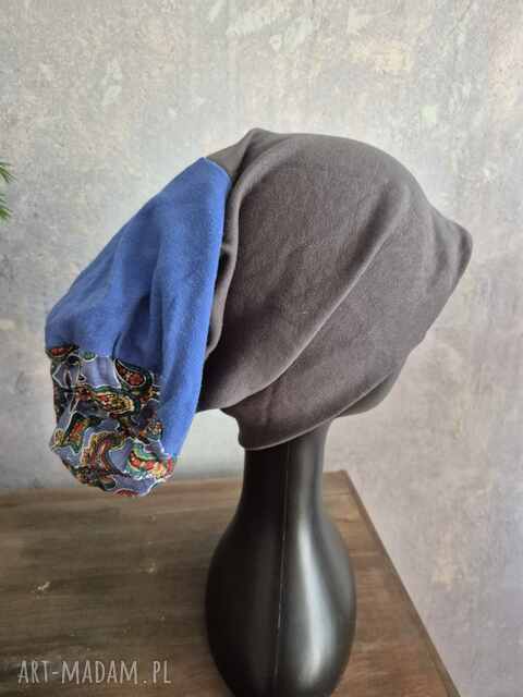 handmade czapka niebiesko - szare długa smerfetka na podszewce świetna na codzienne