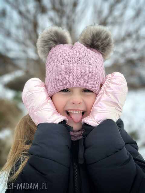 ZESTAW: bawełniana czapka dla dziecka z dwoma pomponami i komin „Brudny róż”